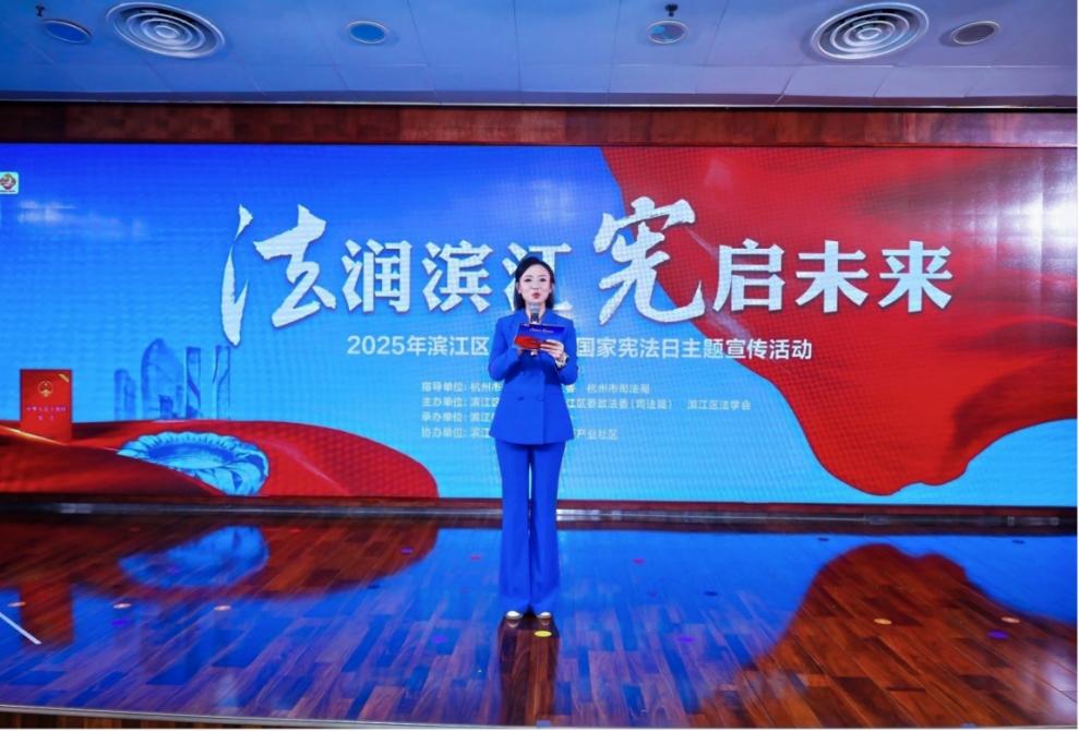 12月4日,第五个“宪法与浙江”主题宣传月暨2025年滨江区“12·4”国家宪法日宣传活动在杭州市滨江区火炬产业社区隆重启动。主会场内,上演了一场集仪式感、专业性和观赏性于一体的法治文艺盛宴。领导干部身着正装,面向鲜红国旗与宪法文本庄严宣誓,铿锵誓言回荡全场,彰显了公职人员忠于宪法、维护宪法权威的坚定信念;法治节目演出精彩纷呈,朗诵、相声、小品、快板等多种形式轮番上阵,将法治精神融入欢声笑语,让群众在观演中深受教育与启发。活动现场还发布了滨江区沿江法治文化带效果图,这条全长约8公里的江畔绿道,沿途结合数智科创特色,融入了宪法和民法典元素,实现“一步一景一学法”,为市民打造沉浸式法治体验新地标。